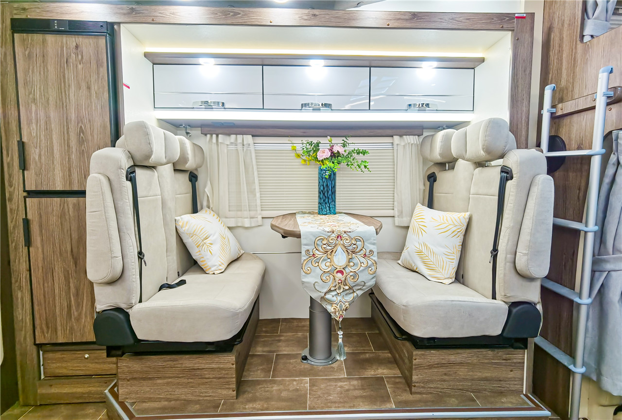 | 正副駕駛椅包 (中間菱形格) | 豪華衛(wèi)浴間 (ABS吸塑工藝) | 升降桌板(進(jìn)口單腿) | ||||